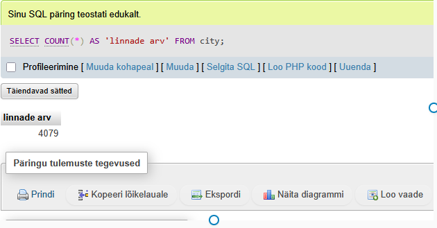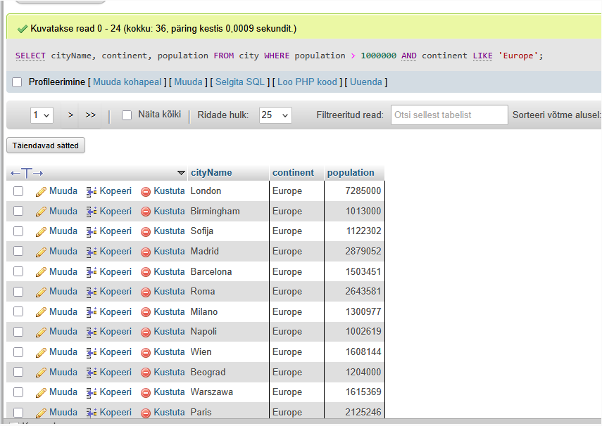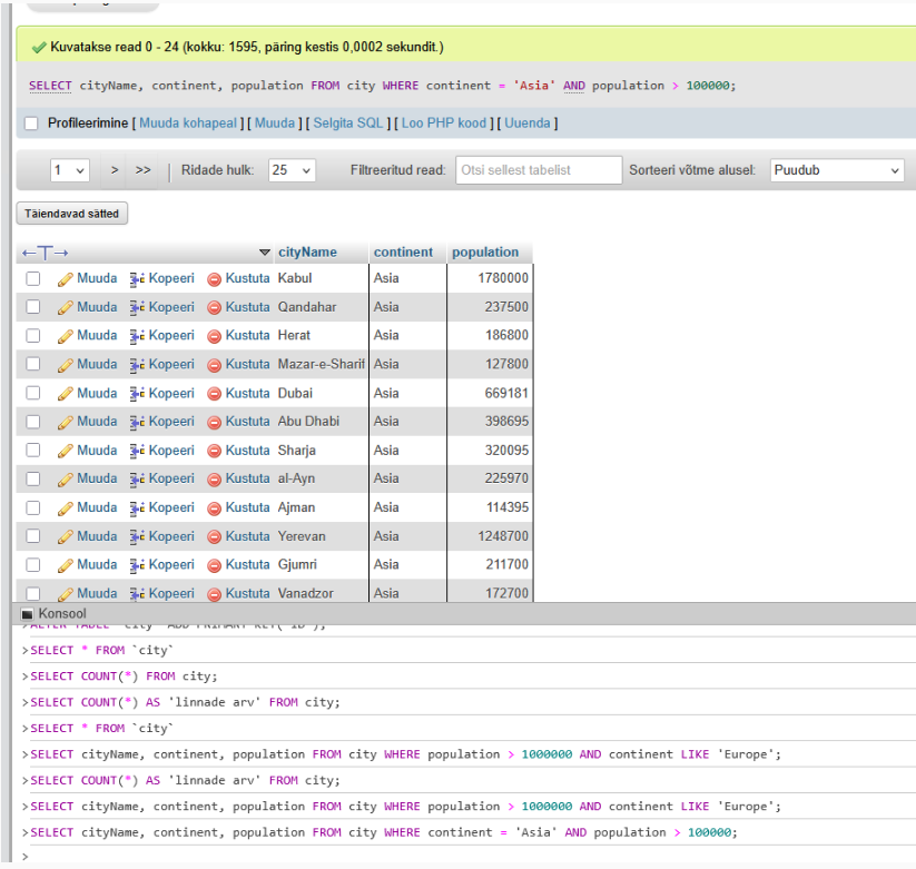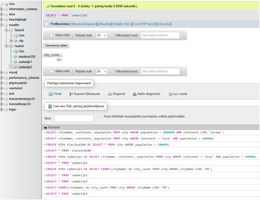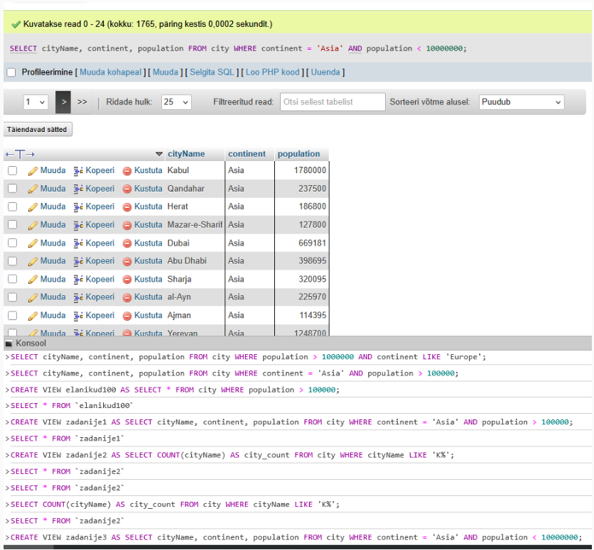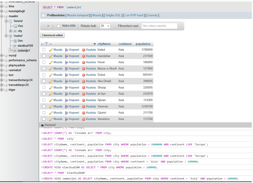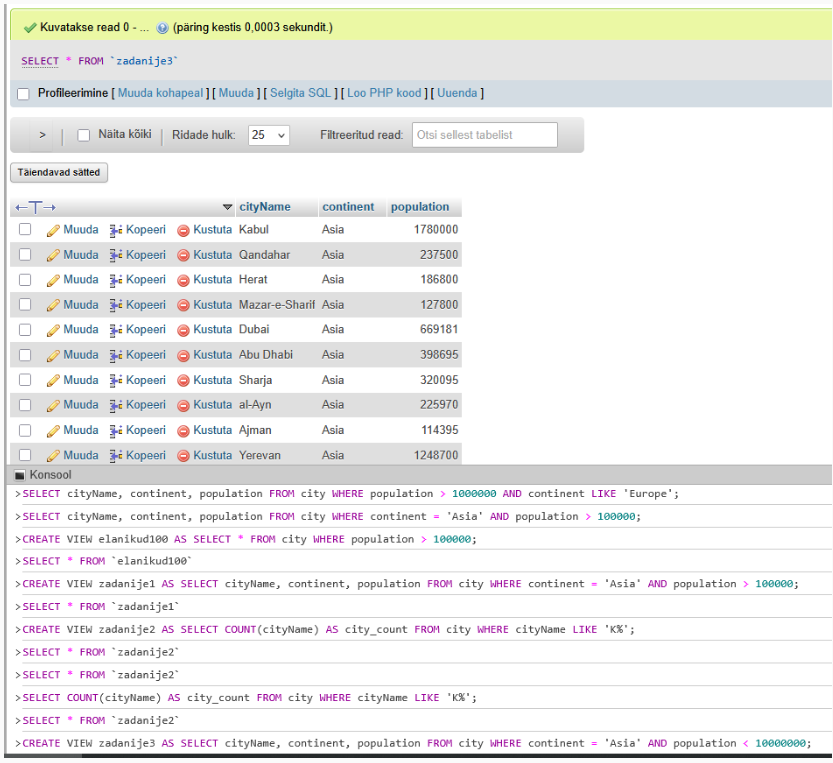 localhost – SQL laused tabelis city. Esimene ülesanne oli: Näidake kõiki Aasia mandri linnu, kus elab üle 100 tuhande elaniku. Veel ma lisasin selle käske Vaate mille nimi on : zadanije1 Teine ülesanne oli: Näidake K-tähega algavate linnade arvu Kolmas ülesanne oli: Näita kõiki Aasia mandri linnu, kus elab alla 10 miljoni elaniku. see on pilt et ma tegin vaate kuhu ma lisasin seda käske: